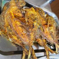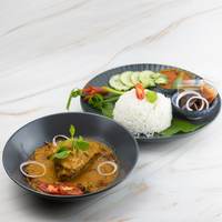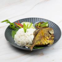 Nasi putih, Ikan Bawal Goreng, Gulai Bendi, Timun, Sambal Belacan,