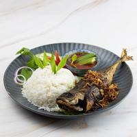 Nasi putih, Ikan Bawal Goreng, Gulai Bendi, Timun, Sambal Belacan,
